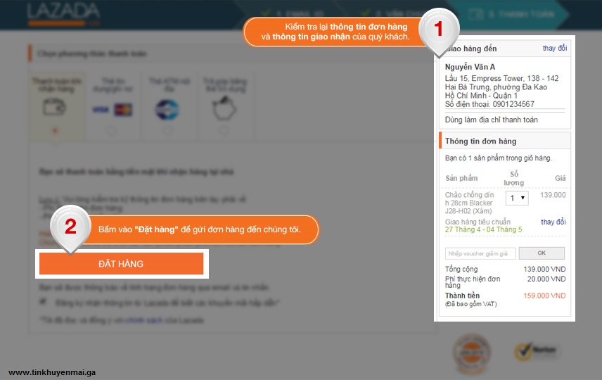 + Giao dịch không thành công, Lazada sẽ liên lạc lại để thông báo